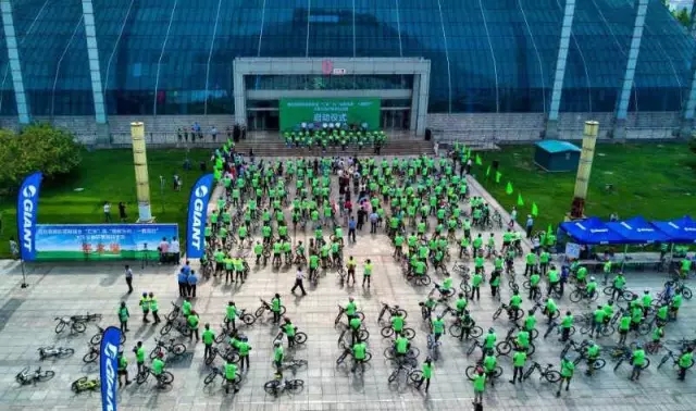 活动现场,400余名骑行爱好者身穿绿色文化衫,手带绿丝巾,围绕大美红莲湖缓慢骑行,首尾相连,甚是壮观。
