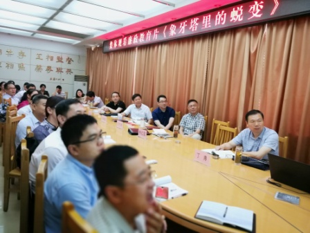 为深入学习贯彻党的十九大精神和习近平新时代中国特色社会主义思想,坚持全面从严治党,加强机关党风廉政建设,6月4日,市委统战部组织集体观看《“象牙塔”里的蜕变》警示教育专题片。部领导邱承江、杜海圣、荣先锋参加。